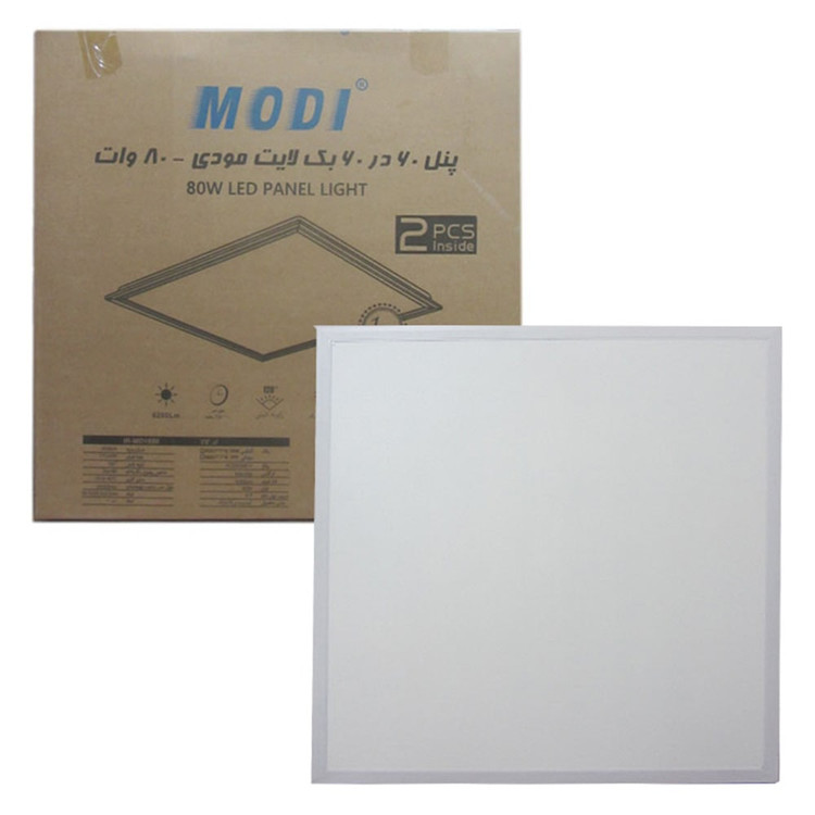 پنل 60*60 بک لایت 80 وات مودی ابعاد طول و عرض این پنل 595*595 میلی متر با ارتفاع 30 میلی متر و بشکل مربع میباشد. این پنل دارای سه رنگ نور آفتابی ، نچرال و مهتابی بوده و بدنه آن به رنگ سفید (الکترو استاتیک پودری) است. زاویه پخش نور این محصول MODI در حدود 120 درجه و میزان انتشار نور در حد 4200 لومن برآورد میگردد
